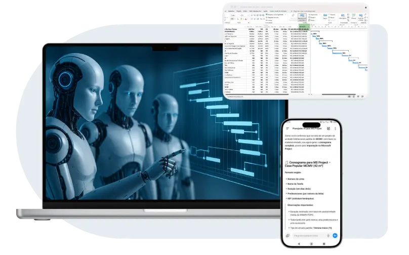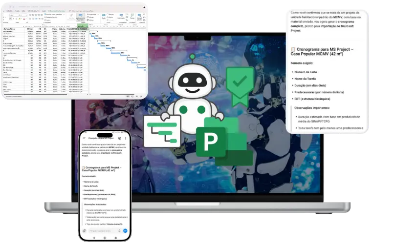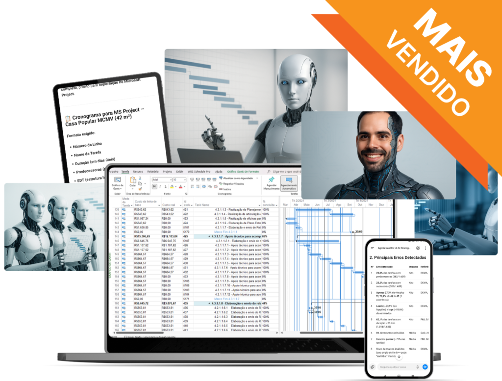 Não. O Planejador IA já entrega o roteiro e as tabelas prontas para colar no MS Project. Você só ajusta o que for específico da sua obra. É simples e direto.